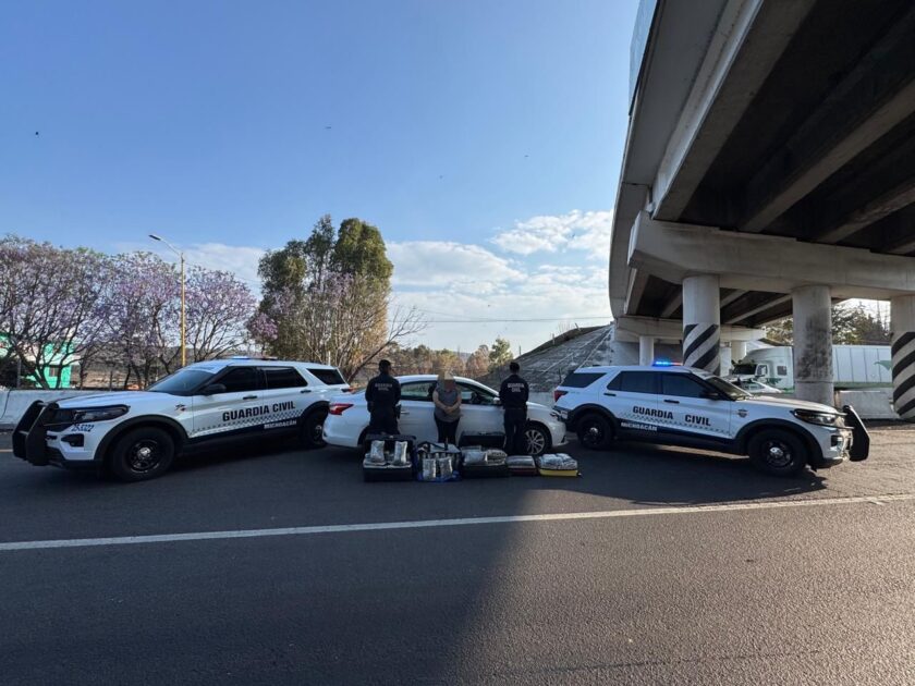 Personal de la Secretaría de Seguridad Pública (SSP) detuvo a una mujer que transportaba cinco maletas con aproximadamente 65.3 kg de hierba verde seca con las características propias de la mariguana. El aseguramiento ocurrió durante labores de prevención y vigilancia sobre la Autopista de Occidente.
