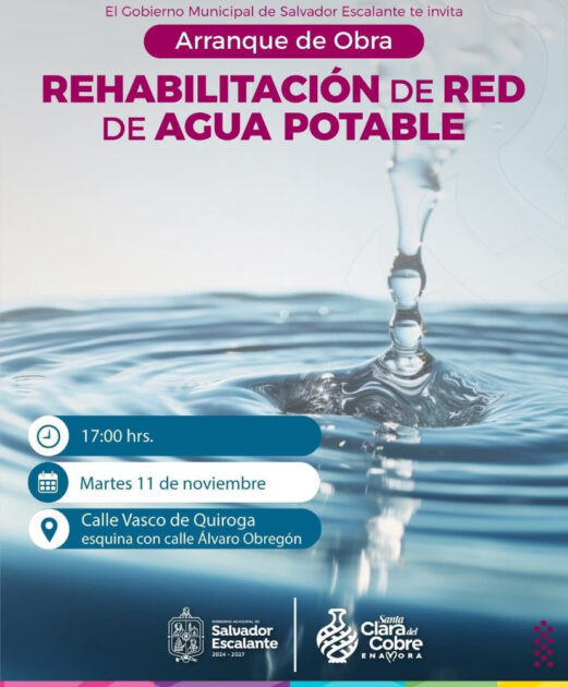 Santa Clara del Cobre, Michoacán.- La presidenta municipal de Salvador Escalante, Dayana Pérez Mendoza, encabezará este martes 11 de noviembre el arranque de la obra de rehabilitación de la red de agua potable, un proyecto que impulsa el bienestar de todas y todos los habitantes. La intervención forma parte de las acciones permanentes del Gobierno Municipal para gobernar con amor, justicia y libertad.