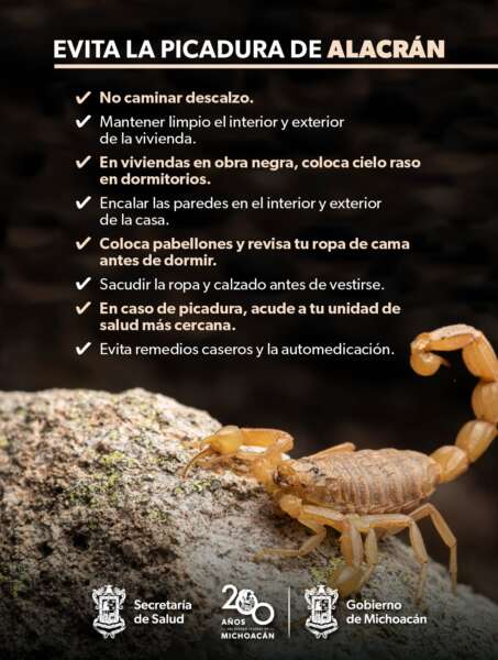 Morelia, Michoacán a 16 de abril de 2024.- Para prevenir las picaduras de alacrán en esta temporada de calor, la Secretaría de Salud de Michoacán (SSM) recomienda a la población revisar y sacudir la ropa, calzado y cama antes de usarlas, limpiar los patios y jardines y sellar grietas de paredes.