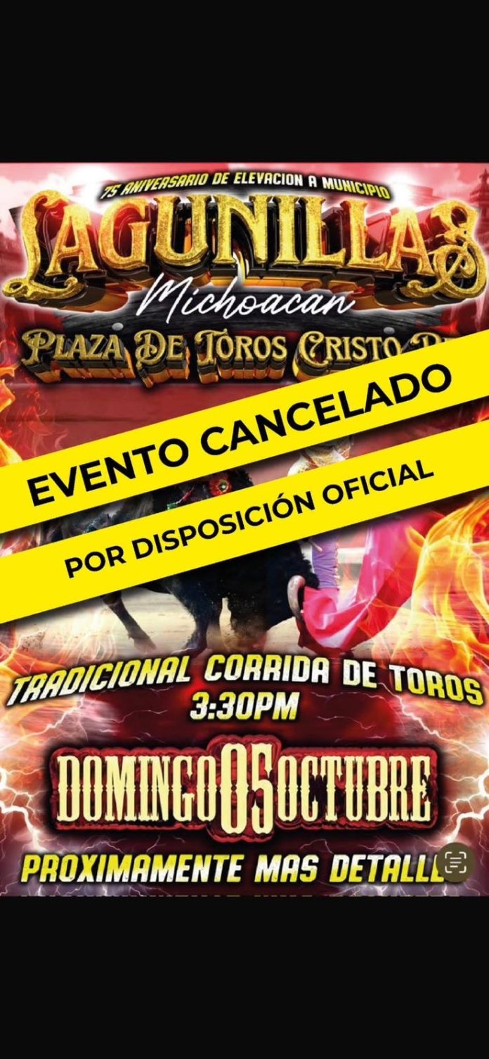 El presidente municipal de Lagunillas, Octavio Chávez Aguirre, informó la cancelación de la corrida de toros programada para el 5 de octubre, en el marco de las fiestas de octubre.